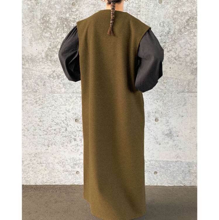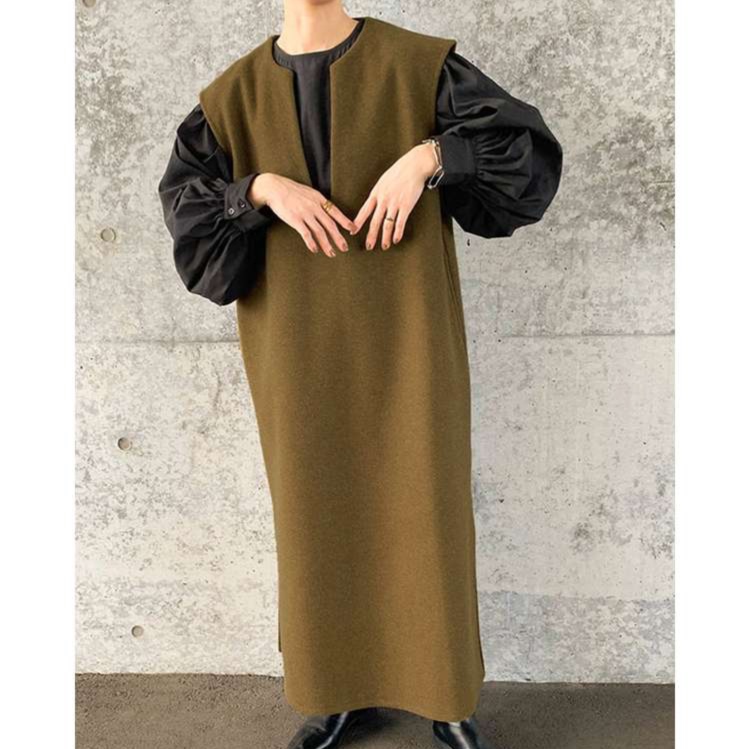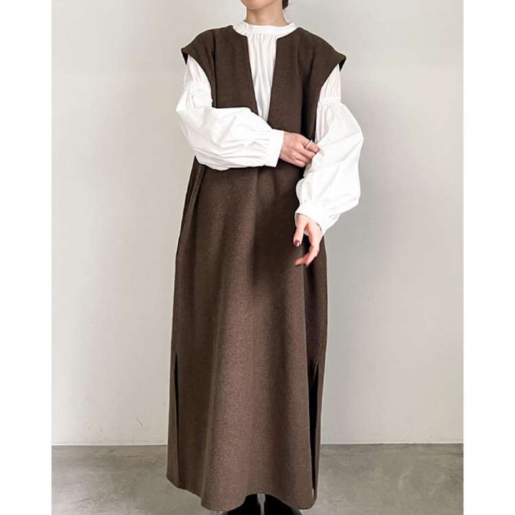ゆったりとした優雅なシルエットのジャンパースカート。エレガントなスタンドネックデザインでモダンな印象に。 着丈はロング丈で、ドレープ感のある生地が美しいaラインを描く。 インナーとのレイヤードスタイルで、季節を問わず着回せる一枚。